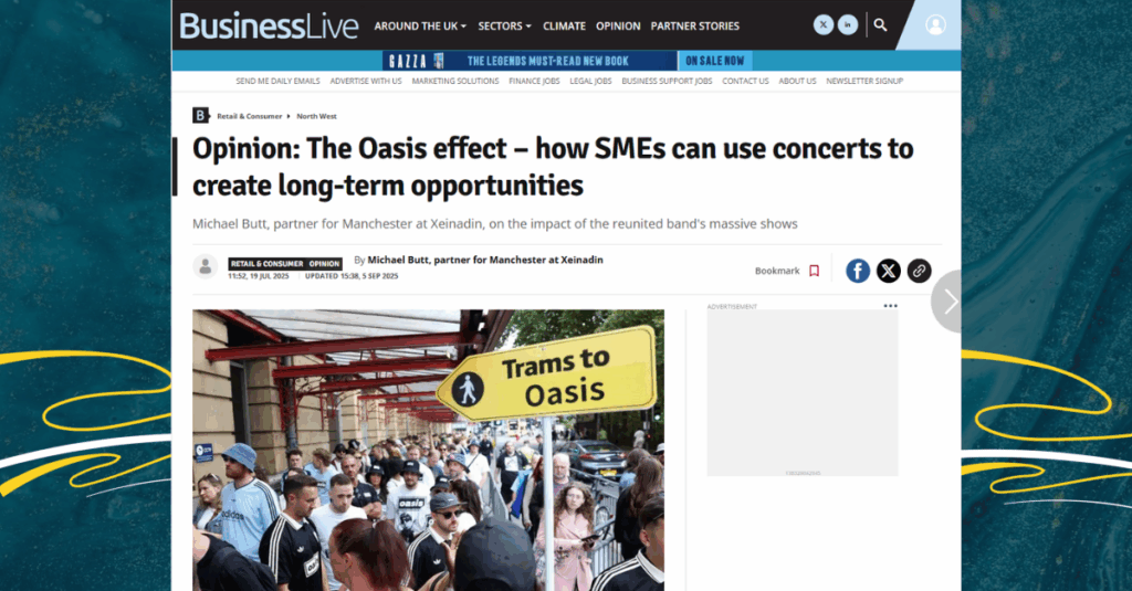 Last month, our Xeinadin Partner in Manchester Michael Butt, featured on Business Live North West with an opinion piece titled ‘The Oasis effect – how SMEs can use concerts to create long-term opportunities’. The article touched on the impact of the reunited band’s massive shows and the fact that Oasis’s July reunion tour was expected to create a new kind of buzz in the city. With 1.4 million tickets already sold and projections indicating a £15 million boost to the UK economy, the effects will be felt most strongly in and around the city.